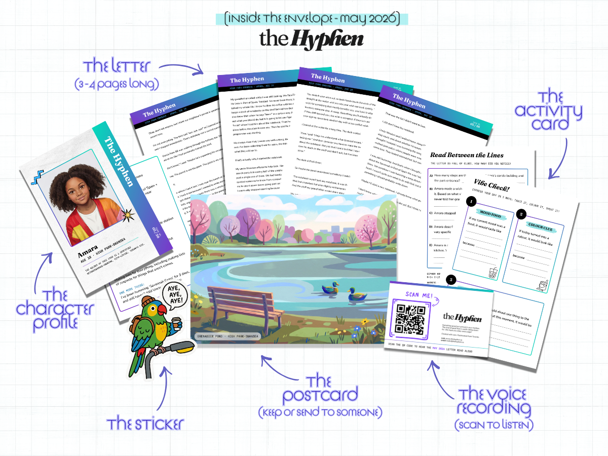 Scan the QR code inside the envelope and hear each monthโs letter read aloud by the author, exactly as it was imagined. Optional, but worth it.